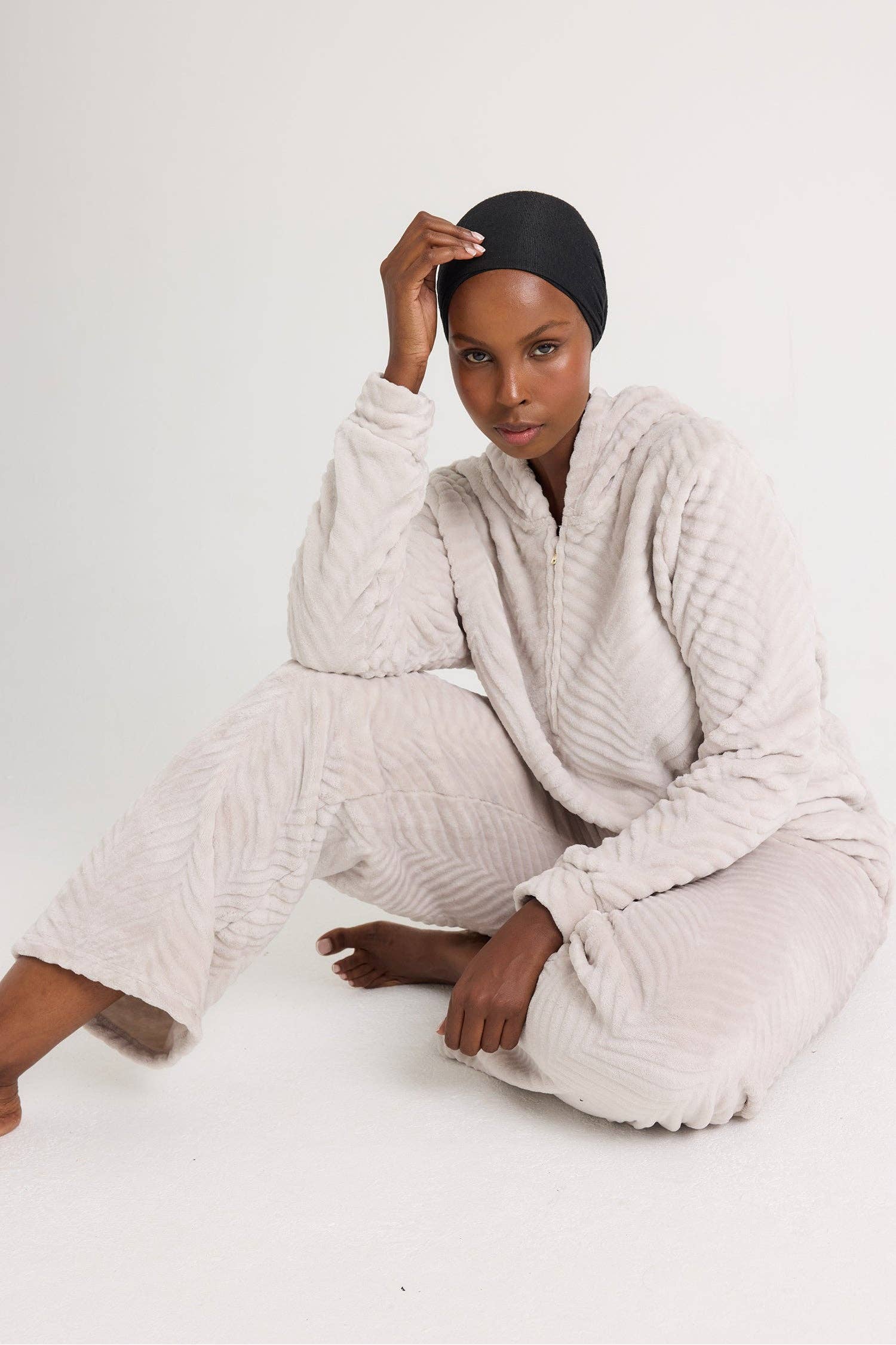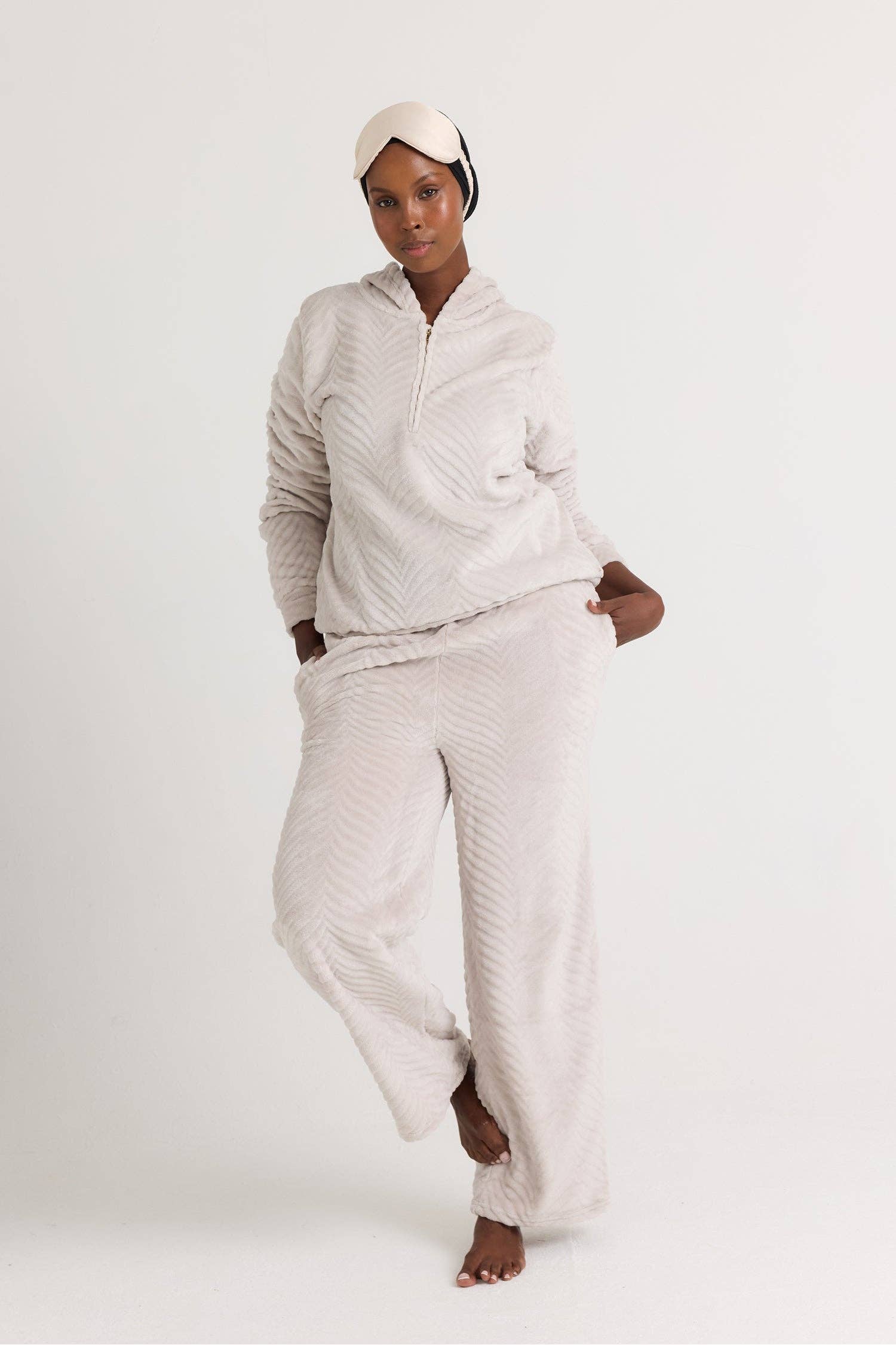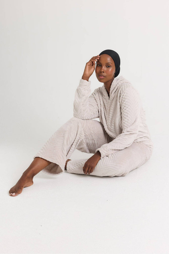 Ever wondered what wearing a warm hug from a teddy bear would feel like? Our new Chevron Lounge Sets have everything covered to bring you the best loungewear yet! The cosy top has full length sleeves and a zip neckline to allow for as much, or little, breathability as needed. The trousers are designed in a wide leg, for a flattering and flexible fit. Wear around the house or for on-the-go comfort. Available in Almond, Rose and Shale Grey.
