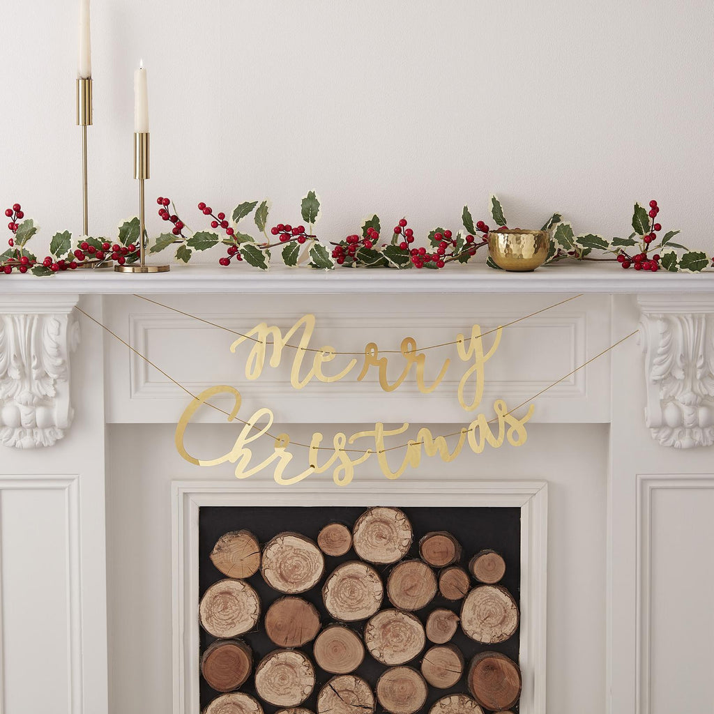 Featuring a stylish scripted font in gleaming gold acrylic, this elegant garland brings a modern edge to your festive home while keeping that classic Christmas charm. Perfect for hanging above the fireplace, across a wall, or around the tree, it’s a statement piece you’ll enjoy year after year.