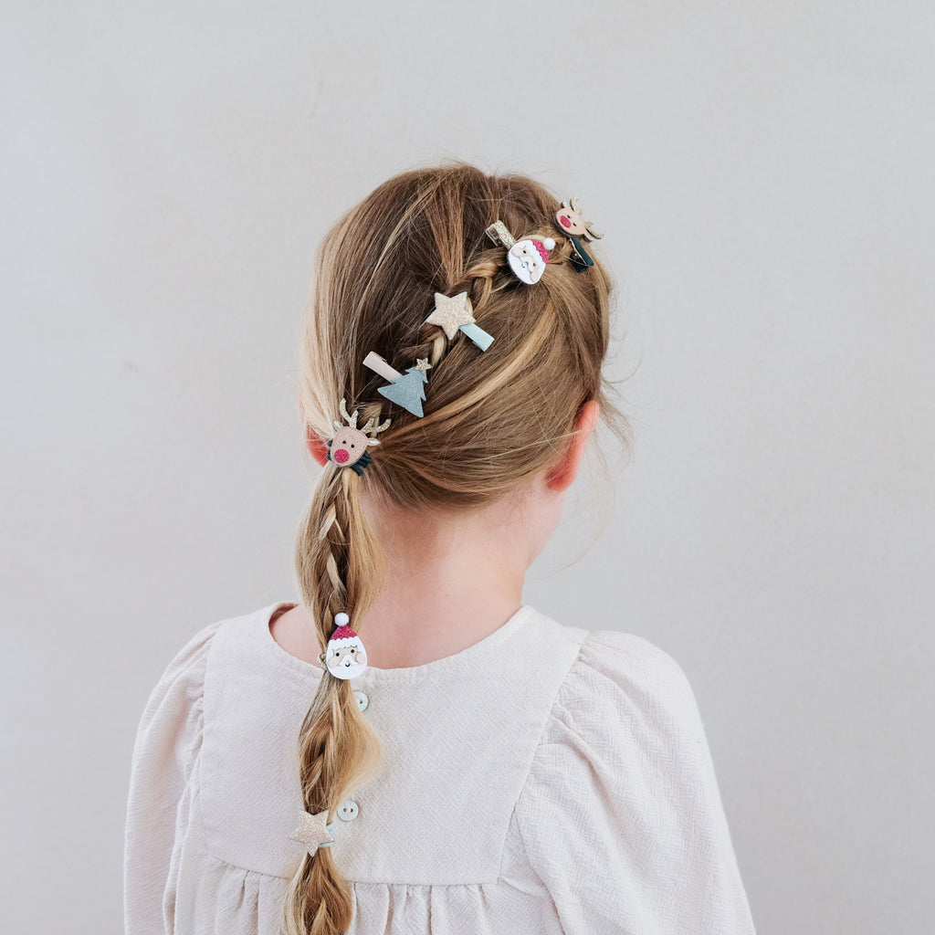 Add a sprinkle of festive magic to your little one’s look with our Mini Christmas Hair Clips (8 Pack). Bursting with angelic charm, this shimmering set is perfect for creating sweet hairstyles throughout the holiday season.