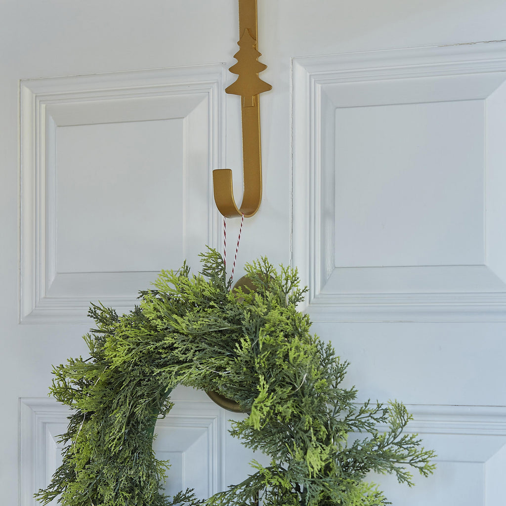 Add a touch of festive elegance to your décor with this Over-the-Door Gold Christmas Tree Wreath Hanger — both practical and beautifully decorative. Crafted in a brushed gold finish, this sturdy metal hanger is designed to securely hold both large and heavy wreaths, making it an essential accessory for your Christmas decorating.