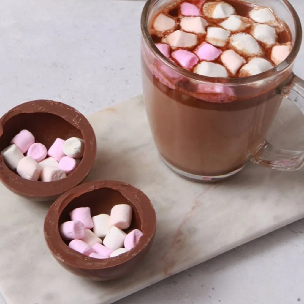 Put the hot chocolate bombe in a mug, slowly pour over steaming milk, and watch as the chocolate melts to uncover the mini marshmallows hiding within.