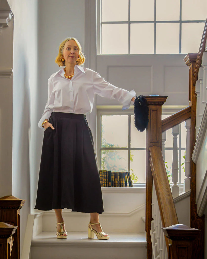 The Audrey Skirt by luxury brand Chalk UK is the epitome of timeless elegance and effortless sophistication. Beautifully designed with a flattering flat front and a half-elasticated waistband, it offers both comfort and style in equal measure. The invisible side zip ensures a smooth silhouette, while the full skirt and discreet pockets add a touch of practicality to this refined piece.