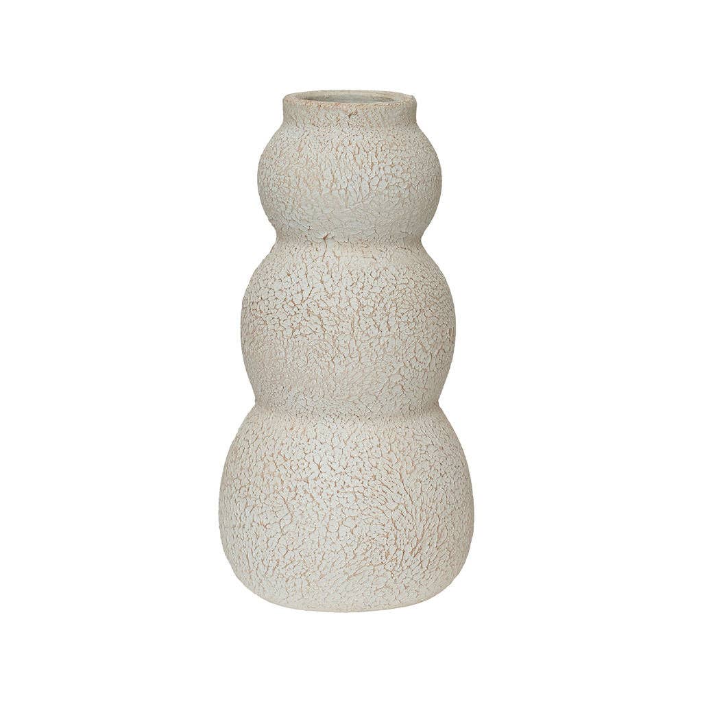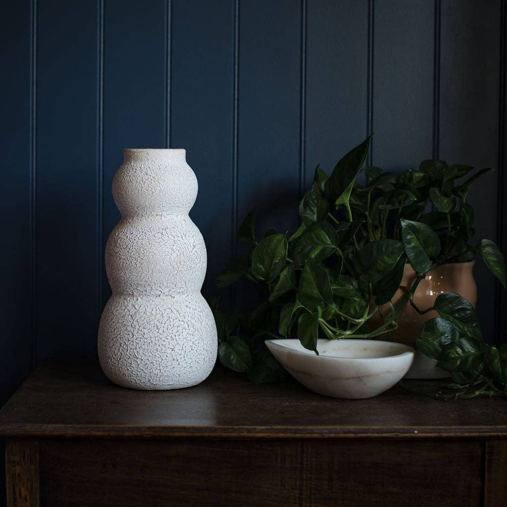 Made from natural terracotta, the vase features a stippled, heavily textured finish that allows the clay's soft, earthy hues to subtly show through its white exterior. The ribbed detailing adds depth and visual interest, creating a sculptural silhouette that feels both timeless and contemporary.