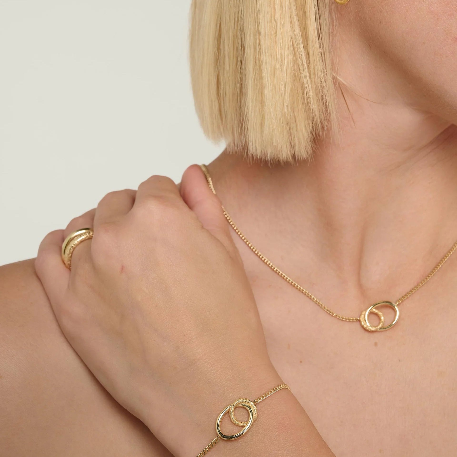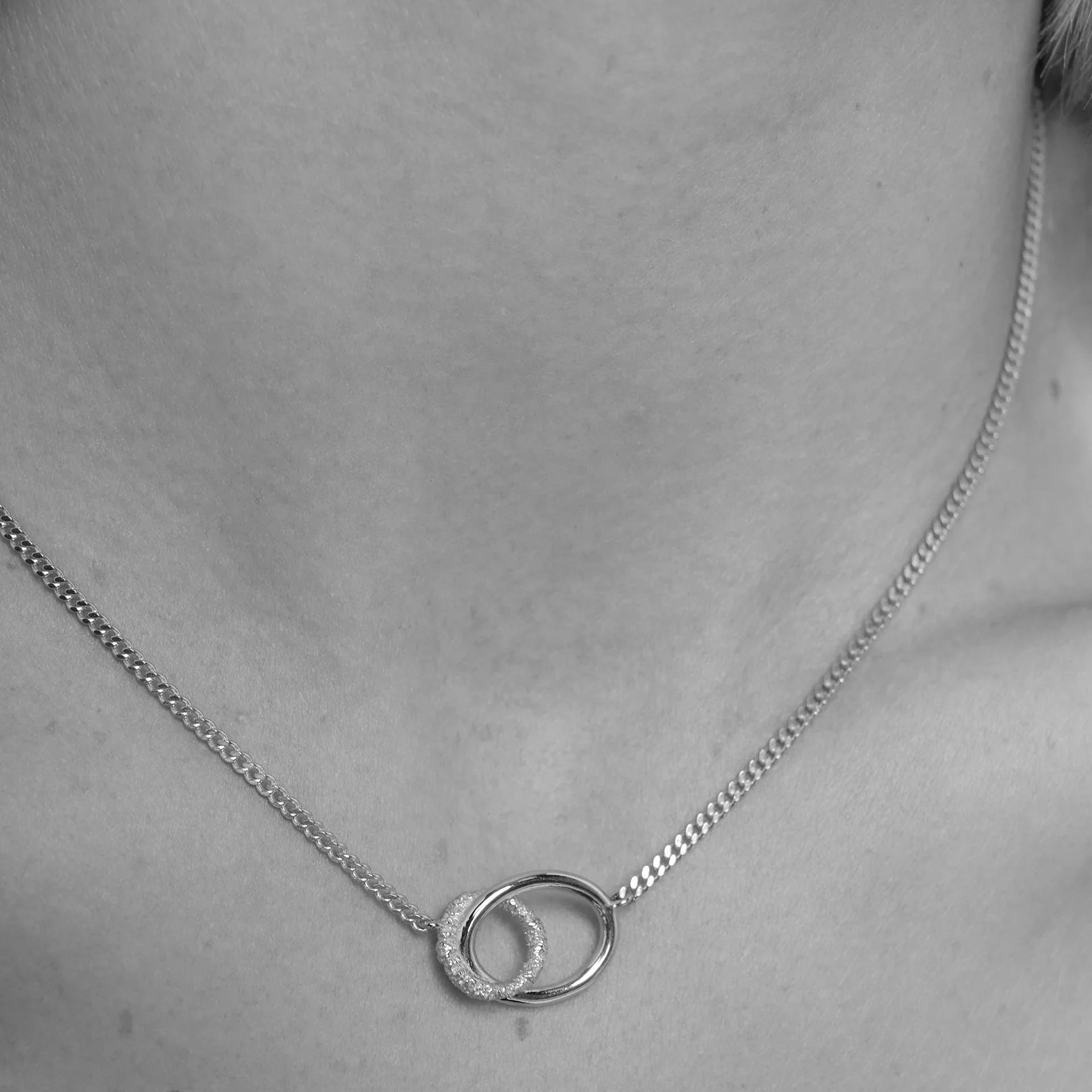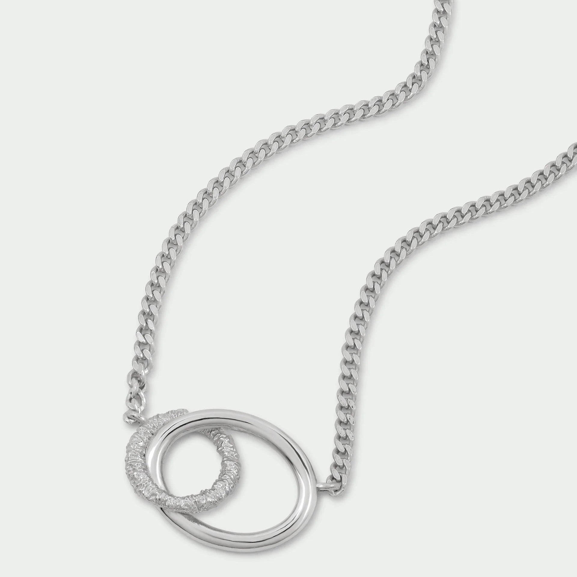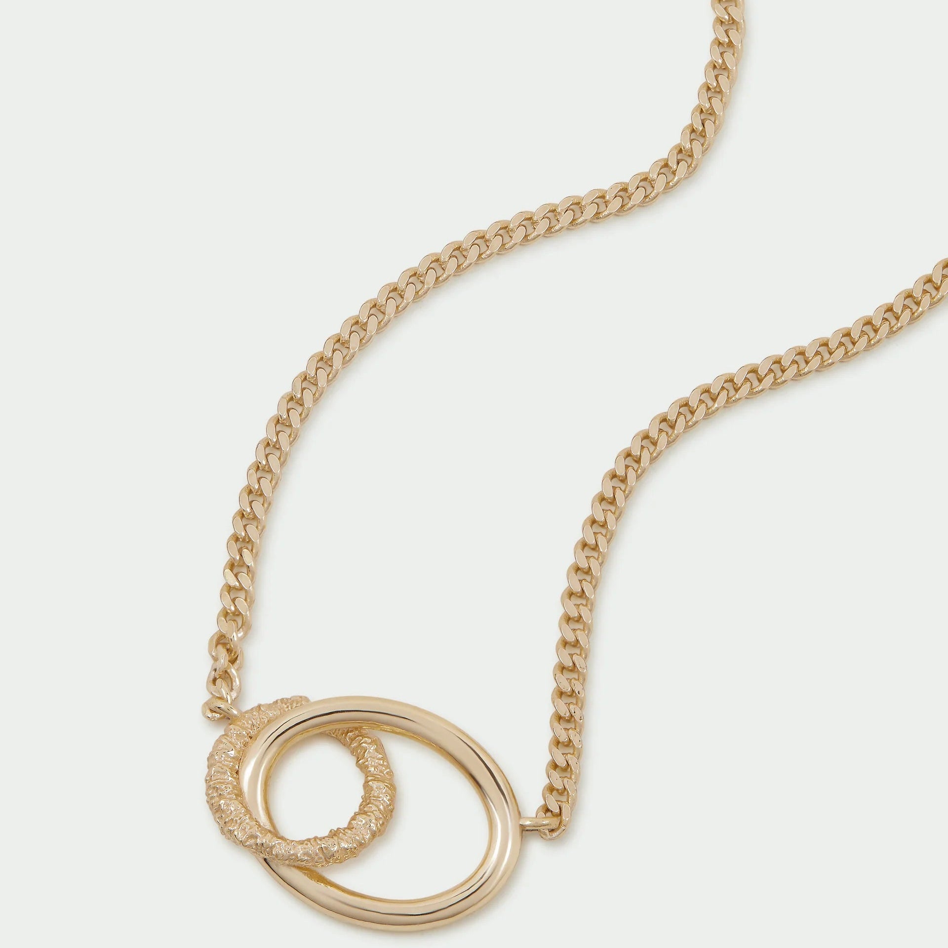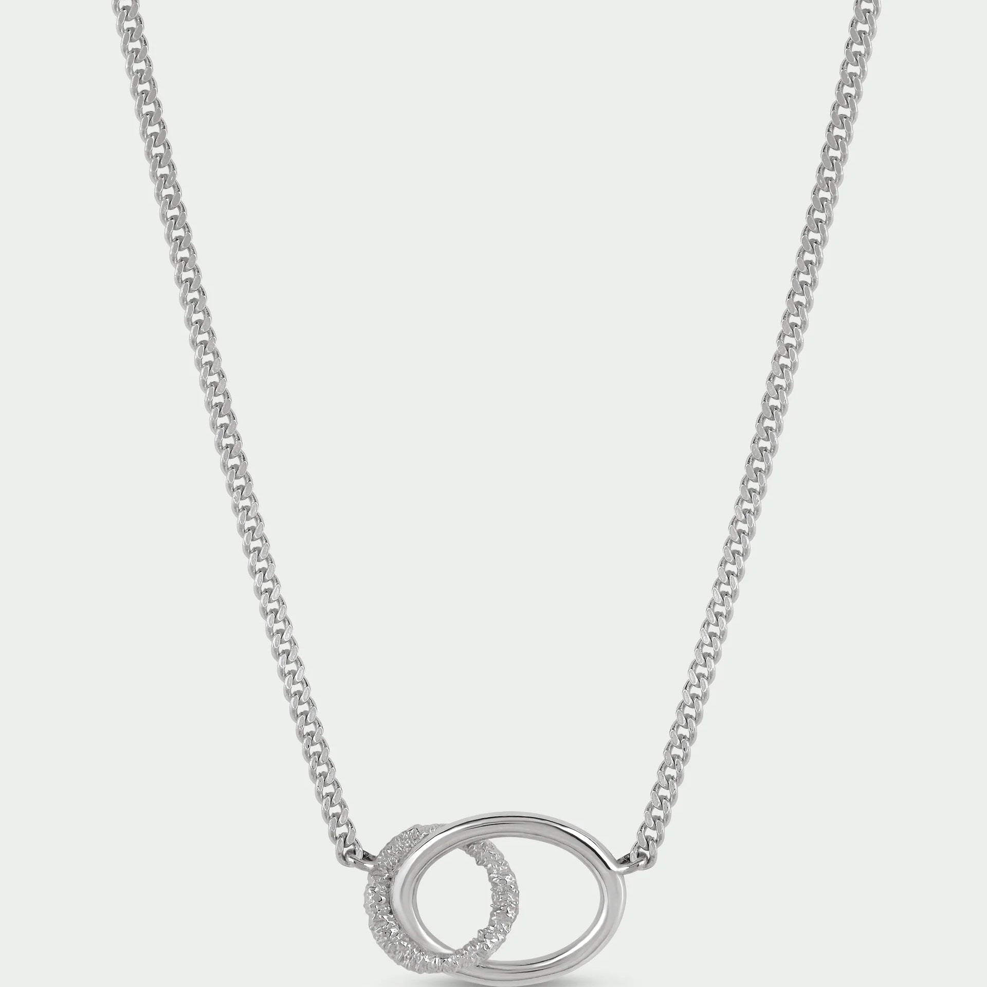 The striking connection link pendant features a beautiful contrast of textured and polished finishes, creating subtle dimension and light reflection. Designed to sit effortlessly against the neckline, it makes a refined statement whether worn alone or layered.