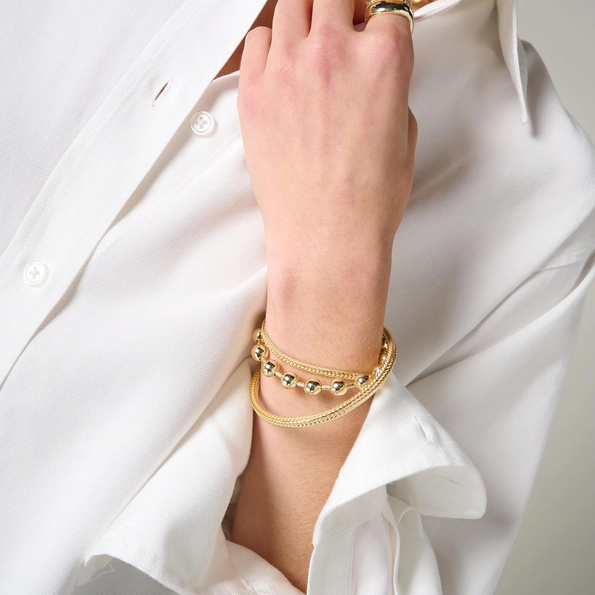 Made from 98% recycled metals, each piece features a solid brass base plated with a considered gold-tone finish. An advanced E-coating protects against tarnish, water and perspiration, ensuring long-lasting shine and durability.