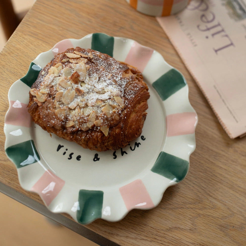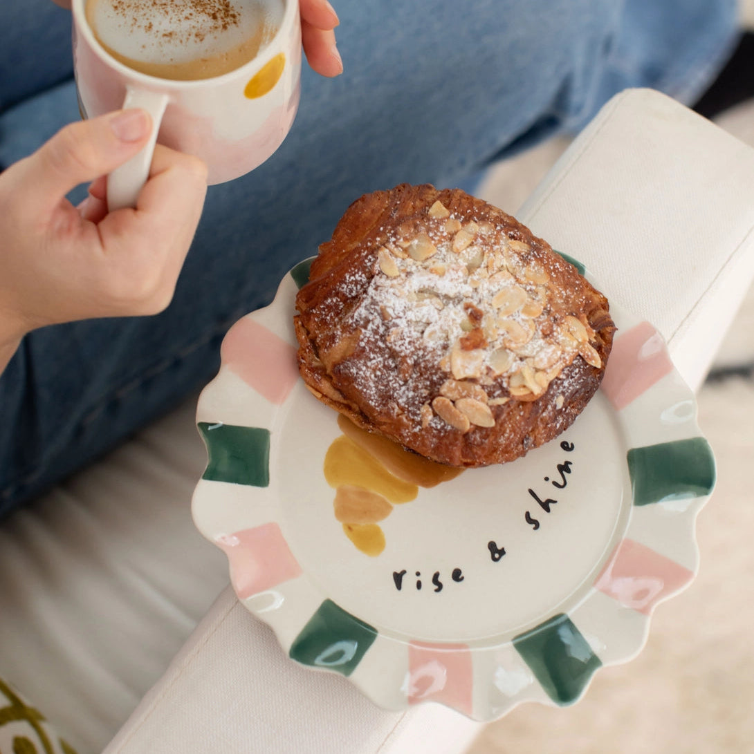 Designed by the in-house London team, this delightful plate features a quirky “Rise & Shine” croissant design, adding personality and humour to your breakfast table or kitchen display. Finished with a charming scalloped rim, it blends Caroline Gardner’s signature playful style with elegant everyday tableware.
