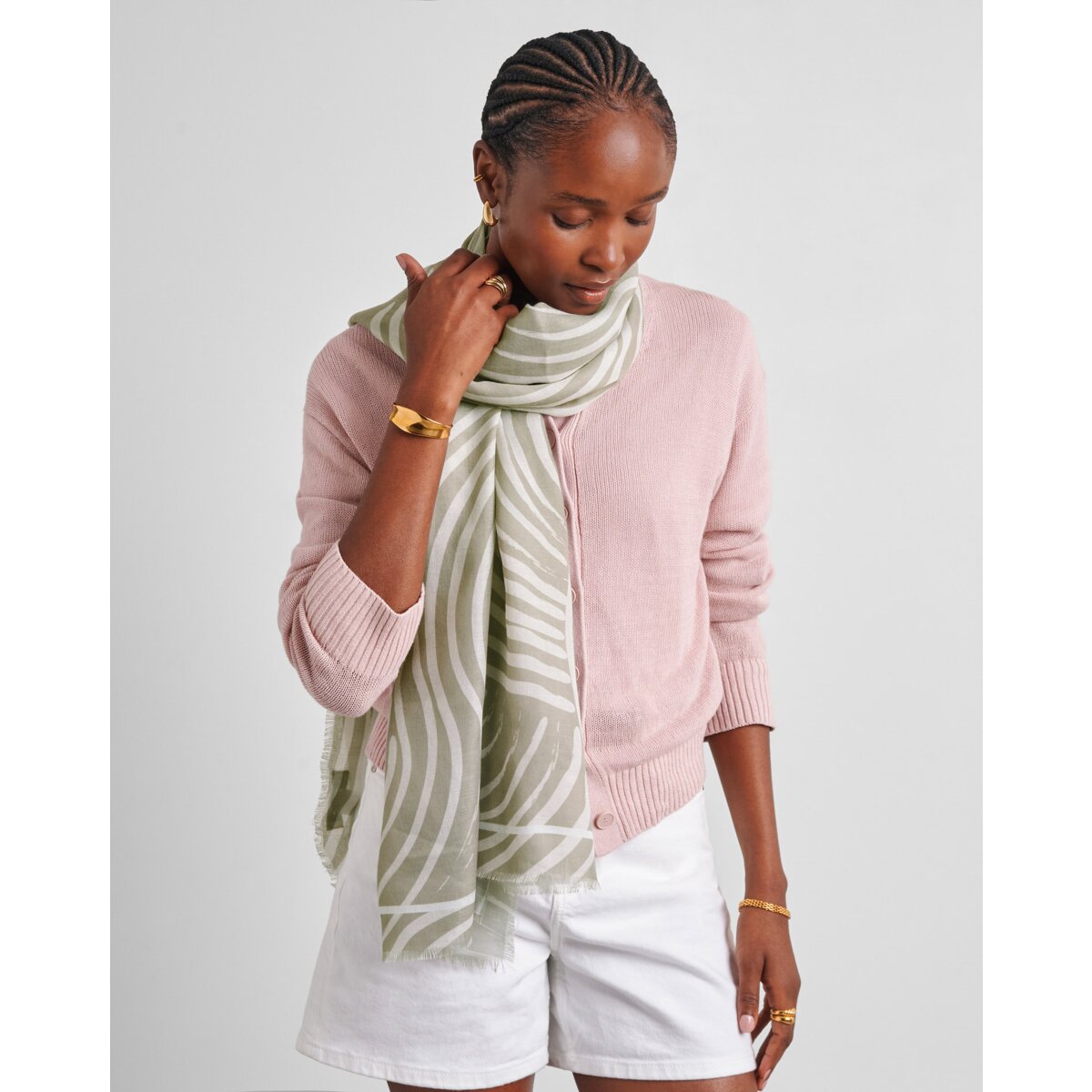 Add a touch of understated glamour to your everyday styling with the Katie Loxton Printed Scarf. Designed in a sophisticated palette of sage and off, this elegant accessory blends soft neutrals.