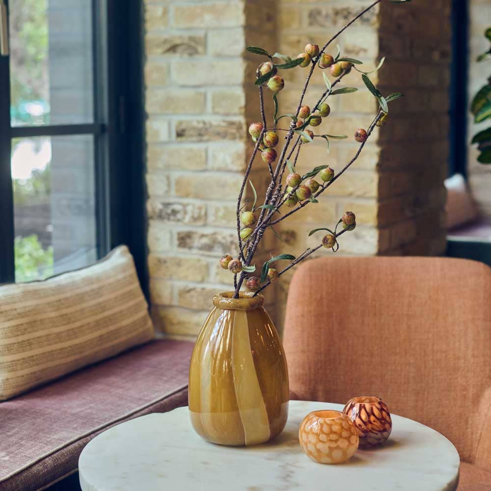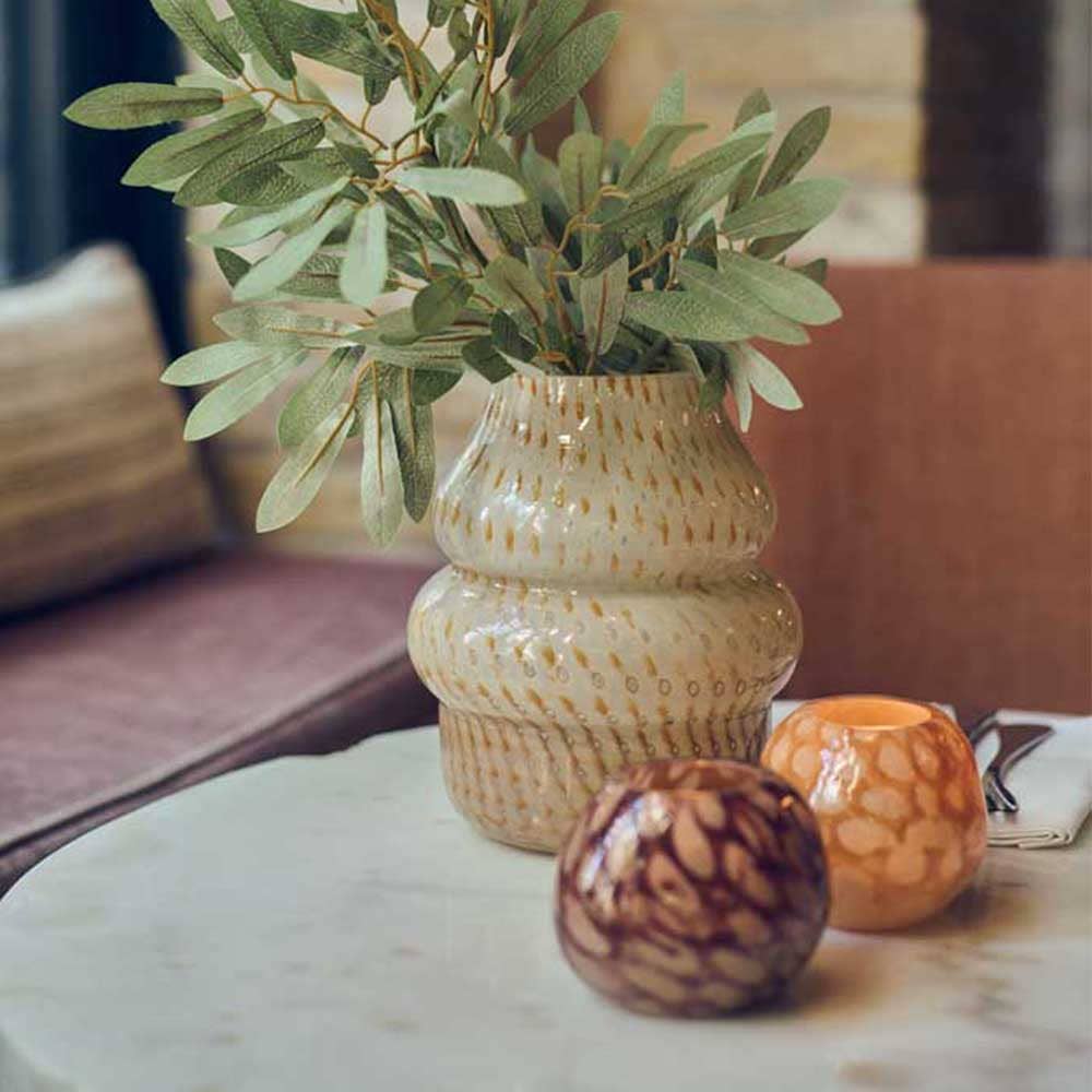 Crafted from glass with a textured finish that catches and reflects the light beautifully, it’s a timeless accent for modern, layered interiors.