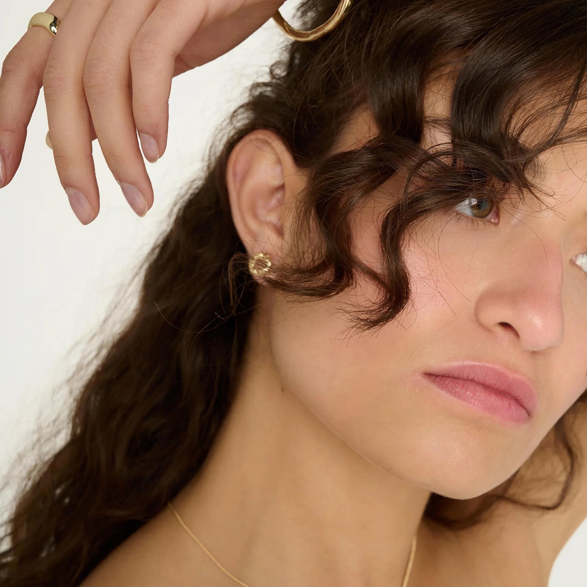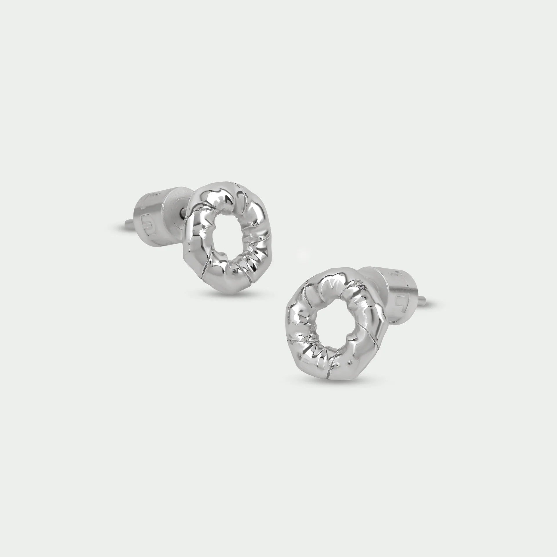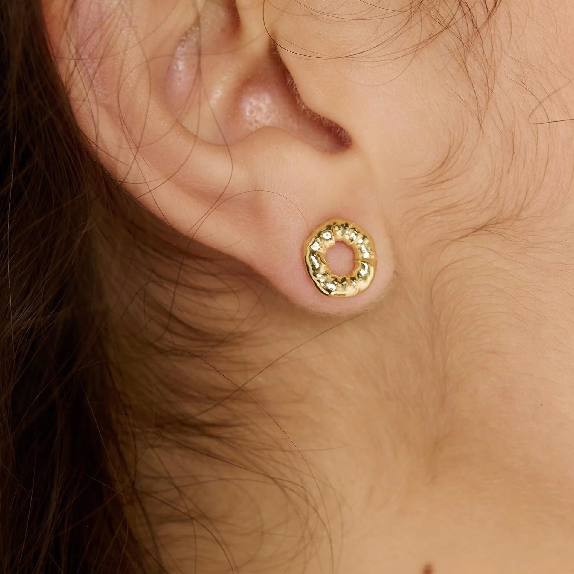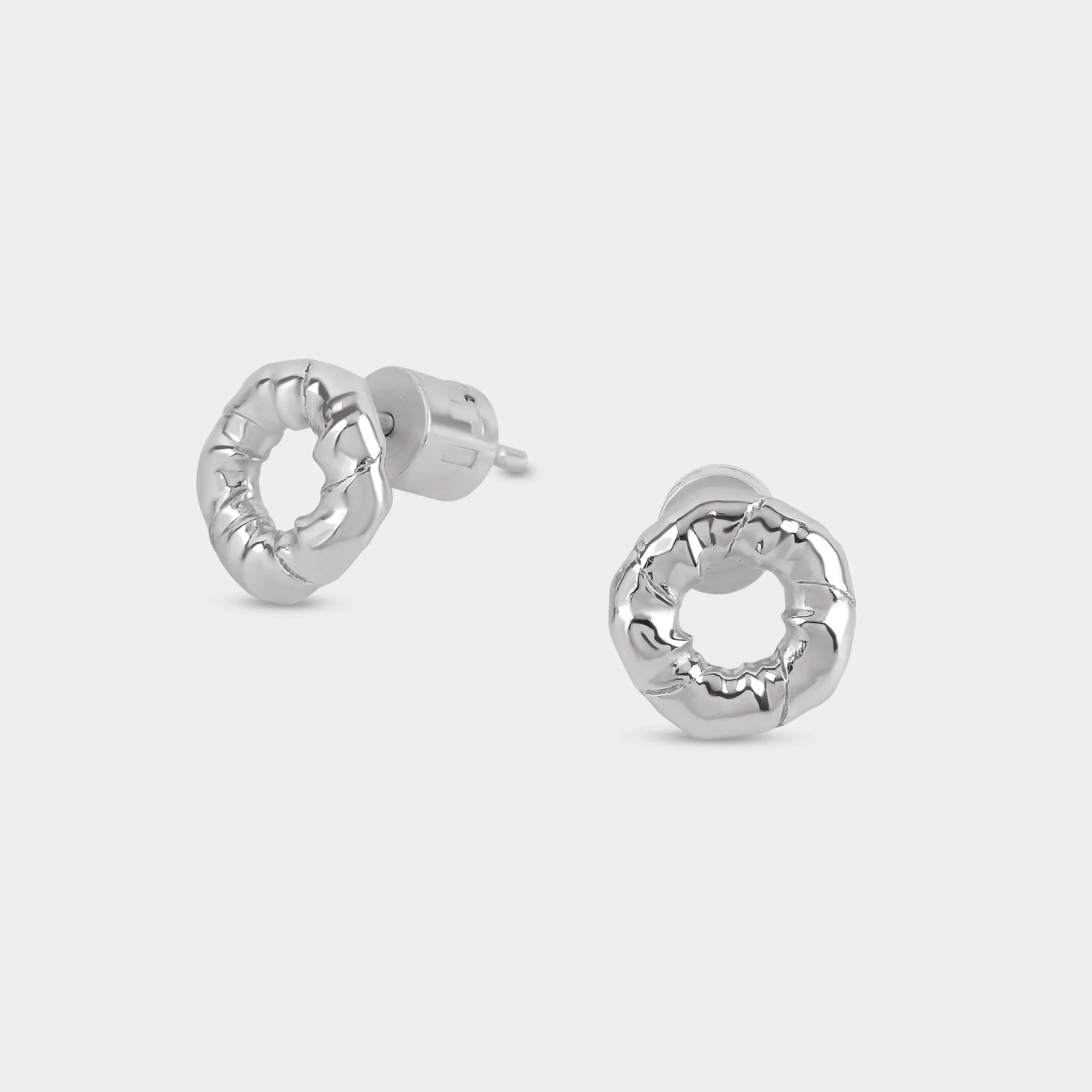Designed as open circle studs with a subtle twisted texture, they offer beautiful dimension and light reflection while maintaining a minimalist silhouette. Their understated elegance makes them perfect for everyday luxury styling or adding polish to evening looks.